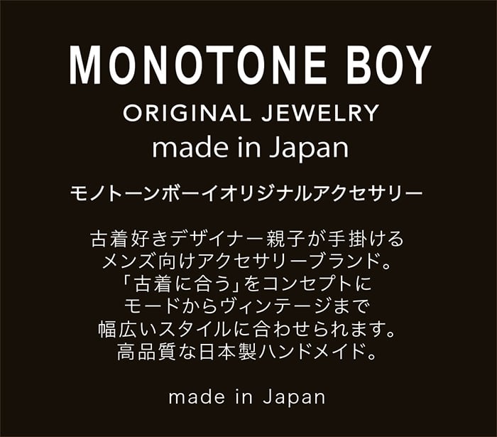 ■真鍮製品(ブラス)は真鍮の地金の風合いを生かすためメッキ処理をしておりません。真鍮地金の特徴で表面にはシミや傷が多数あります。また経年変化により風合いが増す特徴があります。長期間使用しないと稀に緑青と言われる青サビ(無害)が出てきます。地肌に直接触れた部分の肌が黒ずみ洋服を汚すことががあります。除菌アルコールで拭くと汚れなどがきれいに取れすぎて経年によるヴィンテージ感がなくなることがありますのでご注意ください。使用中に痒みや腫れなど金属アレルギーが疑われる場合は着用を止め専門医にご相談ください。